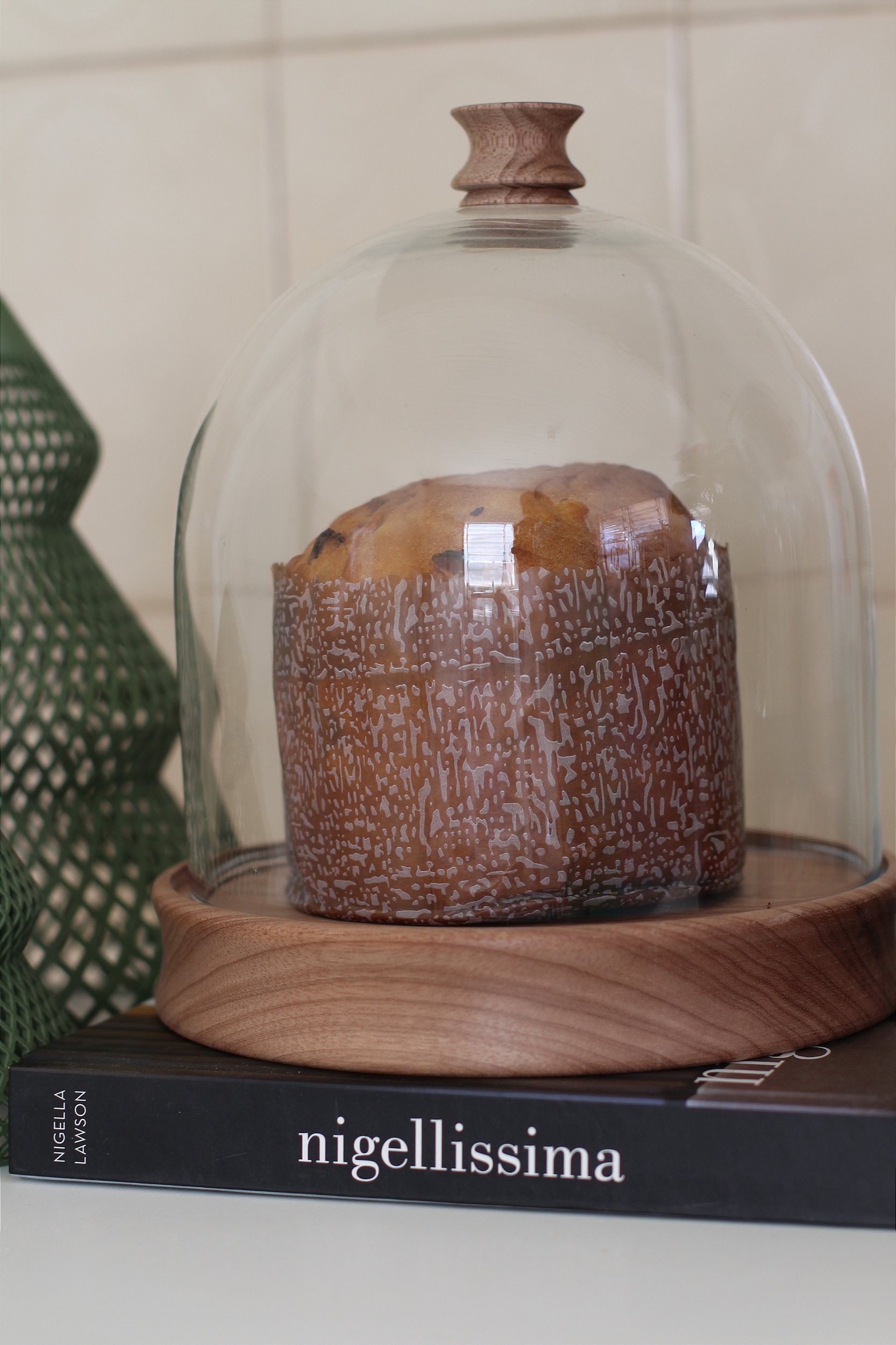 Porta panetone com pé feito de madeira acompanhado de uma redoma de vidro. Este porta panetone veio para deixar sua decoração de Natal mais elegante e com destaque especial para o panetone em sua mesa!